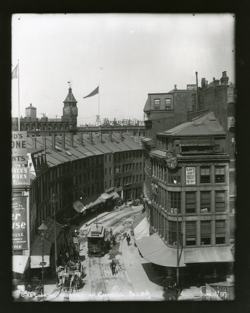 Most of the current Government Center was built in the 1960s after the older buildings were torn down, but small hints of its past remain. The Government Center T station has incorporated old tile mosaic signs from its previous iteration as Scollay Station (the “under” in the mosaic refers to the lower track that is the current Blue Line). Likely the most notable surviving artifact is the steaming kettle. It is affixed to the Sears Block at Cornhill’s former entrance and is steaming away after over 150 years.