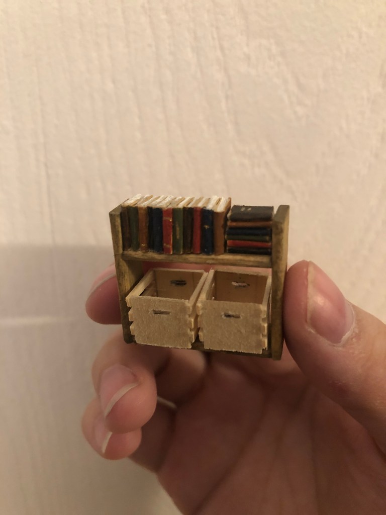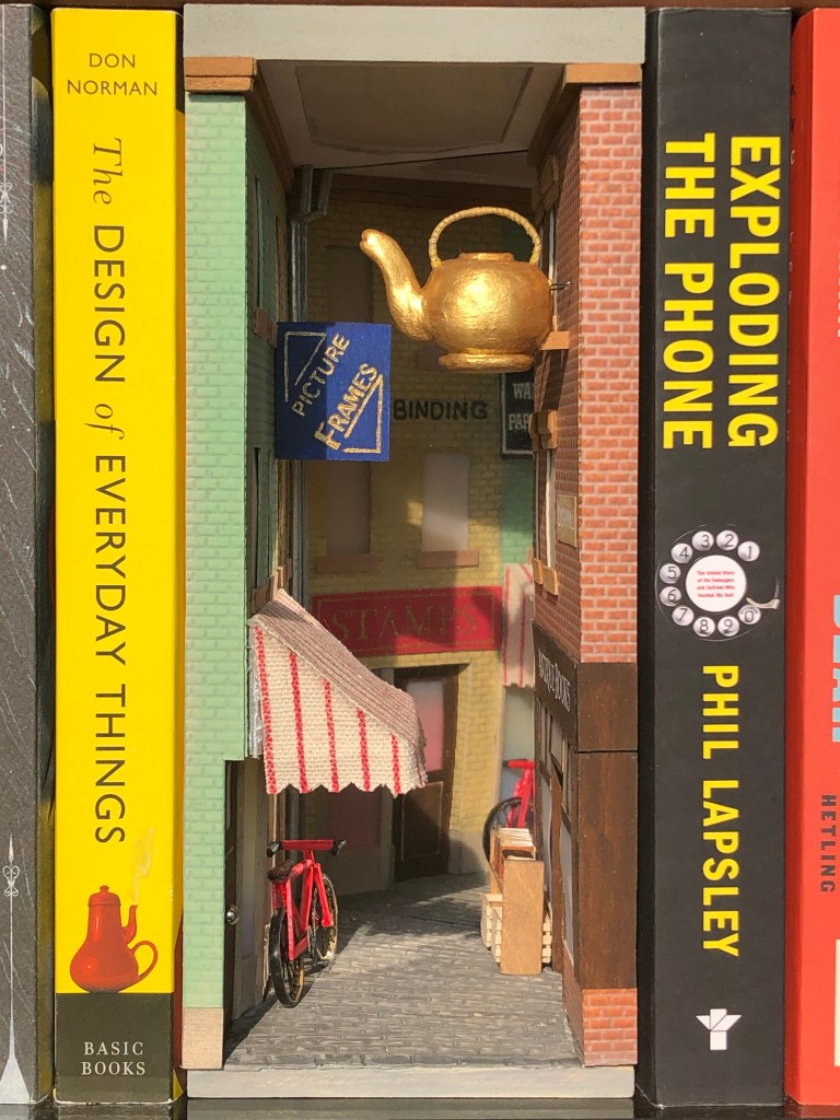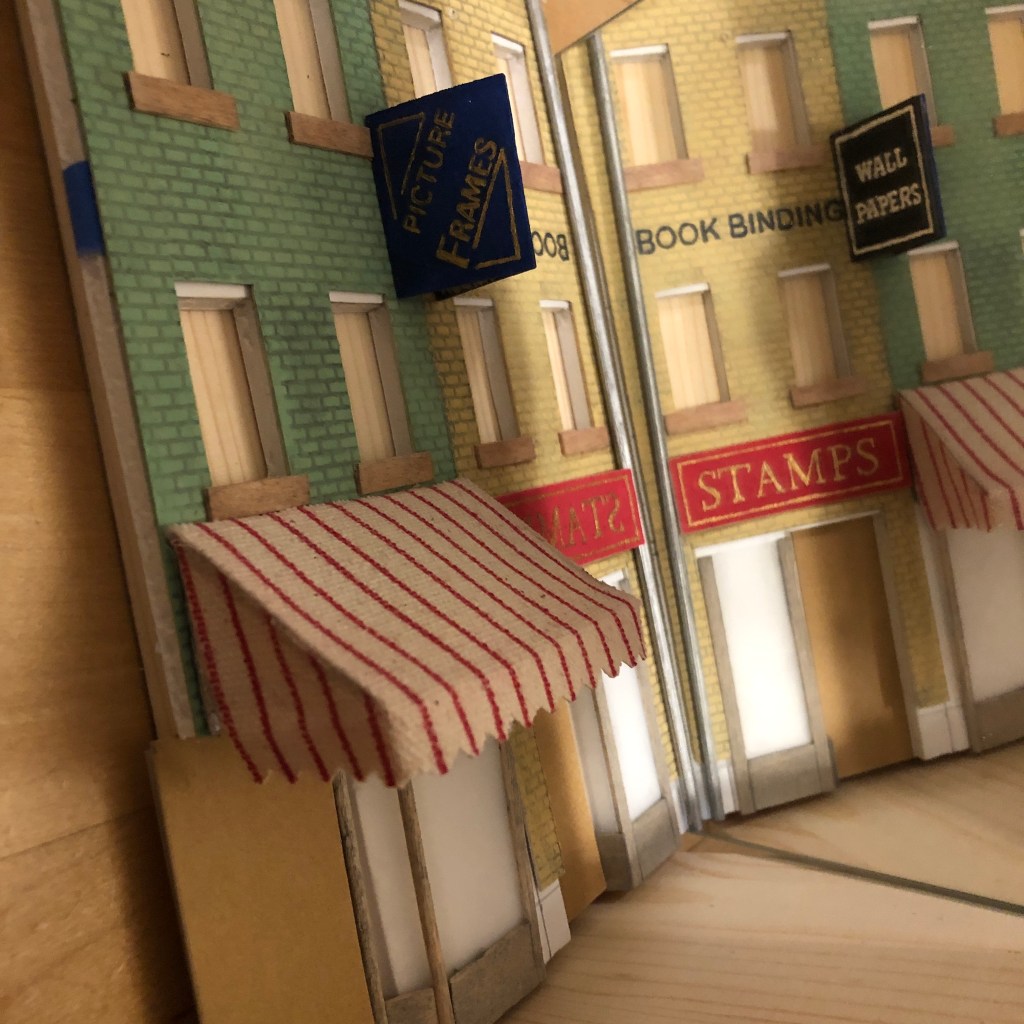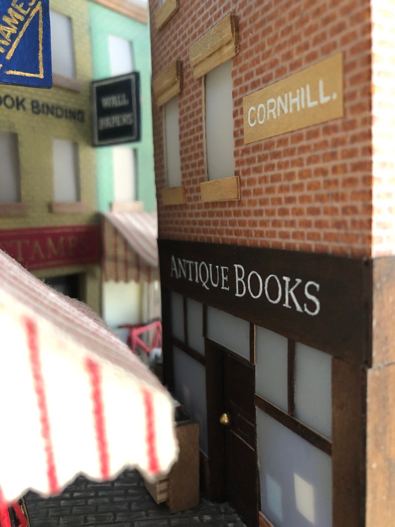 This book nook only uses easily available craft materials and processes, so there are no 3D printed or laser-cut parts. The plastic mirror is set at a slight angle to give the illusion of depth and to mimic the curve of Cornhill. I situated painted signs so they would only be visible on one side of the mirror or the other. For example, the STAMPS sign is painted in reverse since the awning mostly blocks the reversed letters to the viewer.