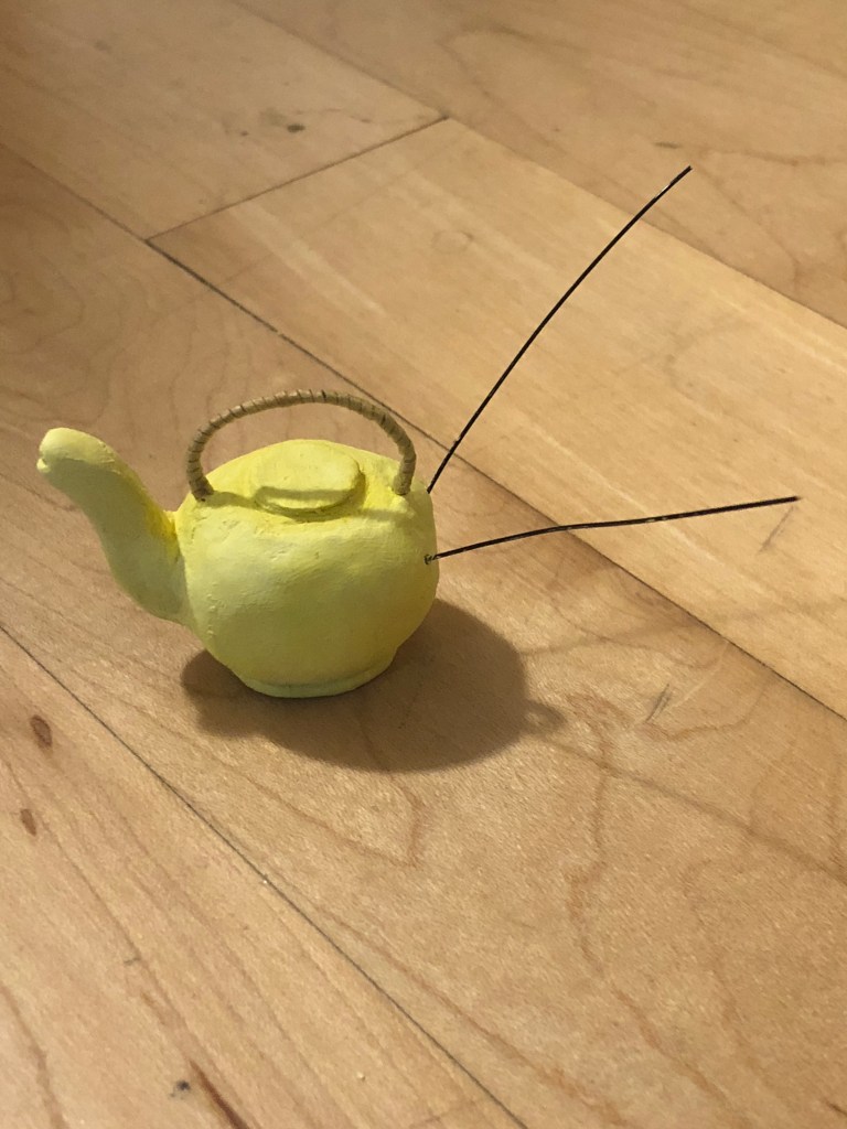 The brick texture of the buildings is from a model railroad brick pattern sheet. This sheet required several coats of paint and a top wash to add mortar lines and grime. The signs are made from thin balsa. I modeled the kettle from air-dry clay and thin gauge wire, and then painted its golden exterior. The street cobblestones are also made from air-dry clay and slightly angled to give the illusion of a continuous, curved street through the mirror. Much of the rest of the buildings are common craft and household materials: toothpicks, bamboo skewers, Popsicle sticks, card stock, foam board, etc.