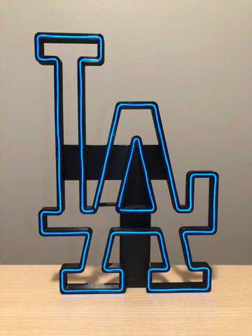 This sign was designed and made as a gift for a major LA Dodgers fan. I did not have easy access to a laser cutter to make an acrylic sign, so I made do with my 3D printer. The A’s center triangle and the outer LA outline are both glued to a thin T-piece that connects the two channels. The bends in the channel hold the wire in place in most sections, though I did need to tack the wire down with some superglue in spots. The battery pack also helps to keep the whole sign upright. The STL files to print your own are located here.