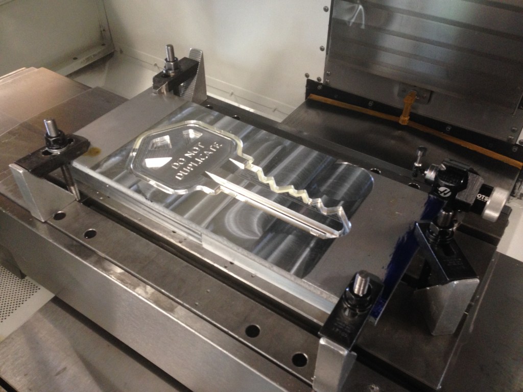 I milled the key from a large plate of aluminum using a face mill, a 1/4″ end mill, a 1/8″ end mill, a 1/16″ end mill, a 1/4″ ball mill, and a 1/8″ ball mill. I fixtured the aluminum to the CNC mill upon some sacrificial blocks and held it down to the bed with strap clamps. I had a part flip to machine both sides of the key. The key was held to the stock using tabs, which I cut with the band saw.